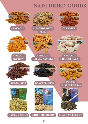 NADI DRIED GOODS ALMONDS ALMONDS WITH OLEASTER PEEL APRICOT APRICOT APRICOT (KISHTA) (CHAPA NAMAK) (SHAKAR PARA) PLUMS RED RAISINS BLACK RAISINS (ALO BUKHARA) GREEN RAISINS WHITE MULBERRY BLACK MULBERRY 44